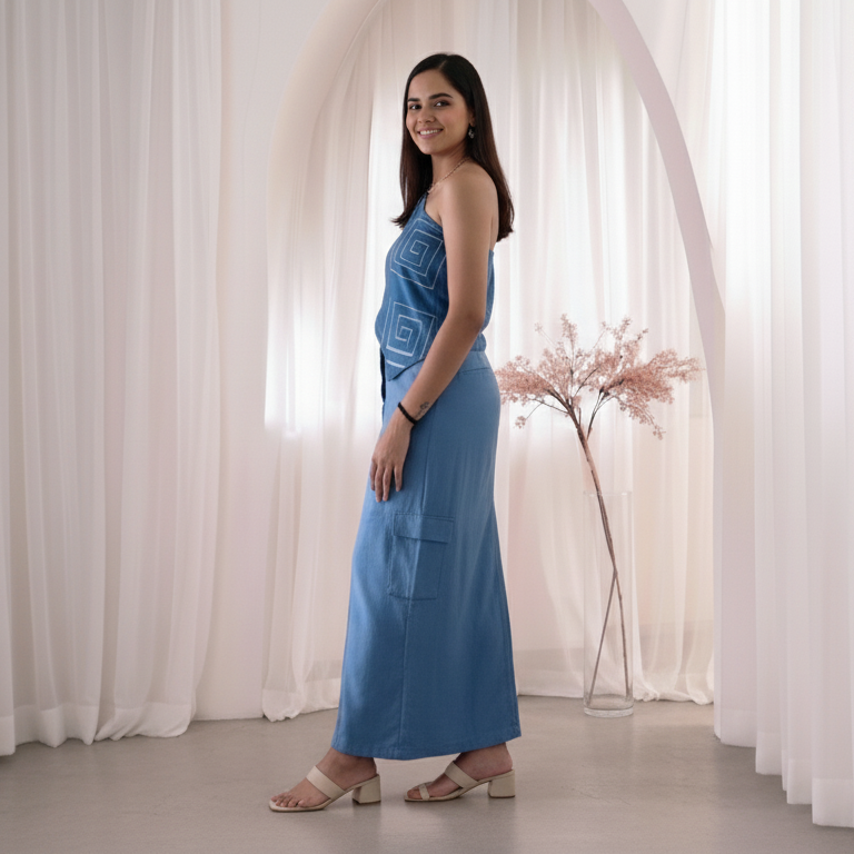 Elevate your wardrobe with our blue one-shoulder crop top, crafted to blend contemporary design with effortless elegance. The striking geometric print lends a bold yet versatile charm, making it the perfect statement piece for any occasion. Paired with our signature parachute skirt, this combination creates a sleek and flattering silhouette that celebrates every figure.