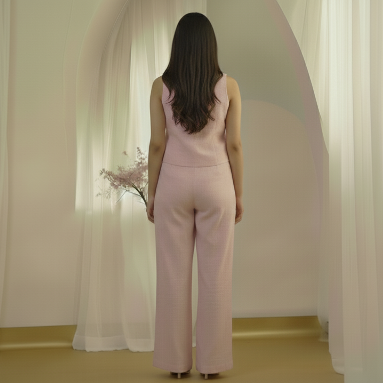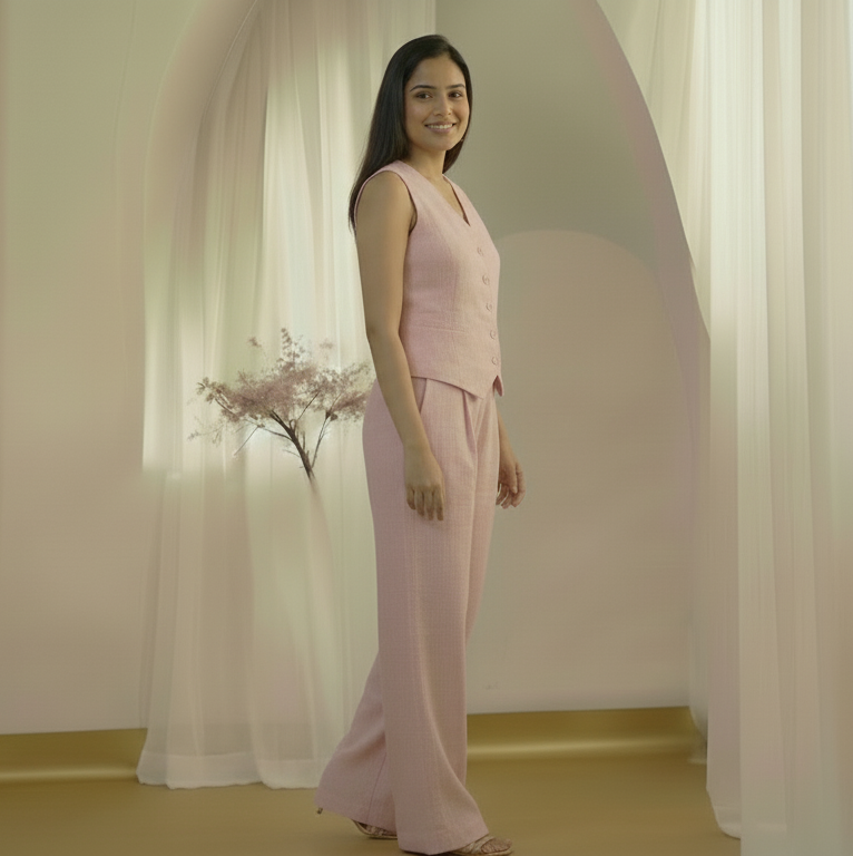 This stunning coordinated outfit redefines modern fashion, featuring a sleeveless pink vest with a tailored peplum and matching wide-leg pants. Crafted to provide both elegance and all-day comfort, this two-piece set is your go-to attire for making a sophisticated statement at any smart-casual or semi-formal event. The soft pink hue and lightweight, textured fabric ensure you look and feel effortlessly chic.