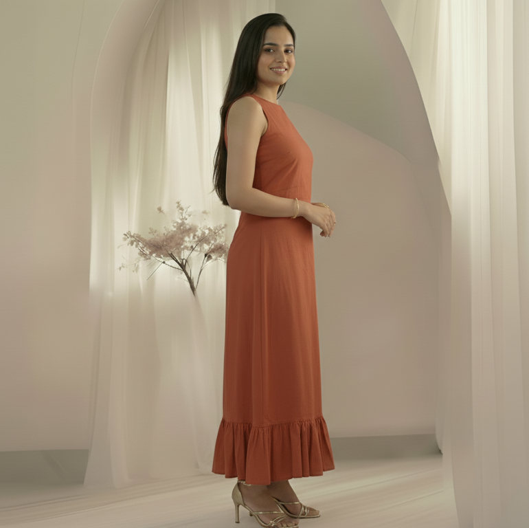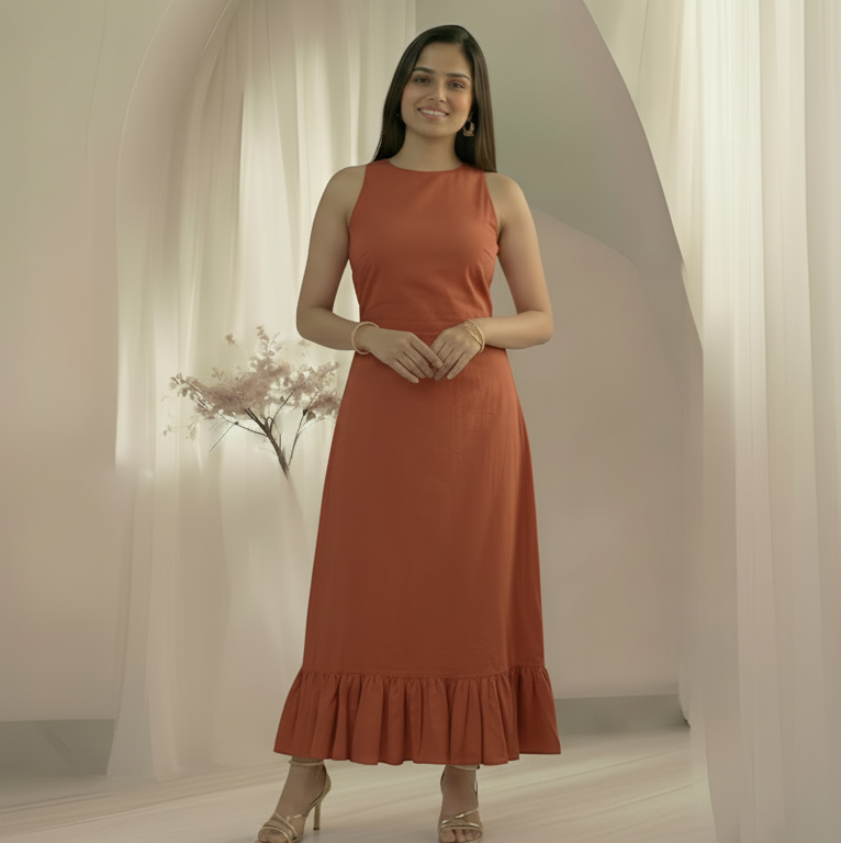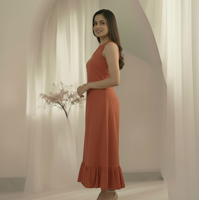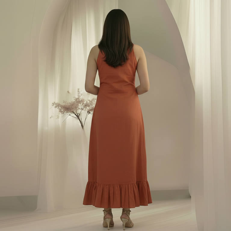 Engineered with a meticulous focus on both design and functionality, this dress offers a perfect fit for all body types. Its premium materials ensure breathability and ease of wear, while the midi length enhances its sophisticated charm. Wearing the Rust Orange High-Neck Midi Dress isn’t just about fashion—it’s about feeling confident and radiant, wherever you go.
